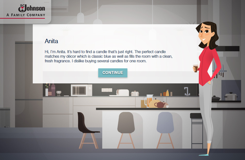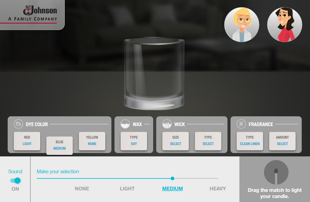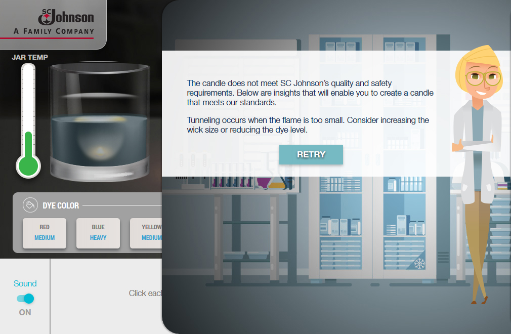 SCJohnson turned its flame scientists loose to help us build this stylish simulation. The objective was to allow the learner to explore various color, wax and wick combinations to see how they affect the flame over time. Needless to say, this is far more engaging than the spreadsheet we started with!
